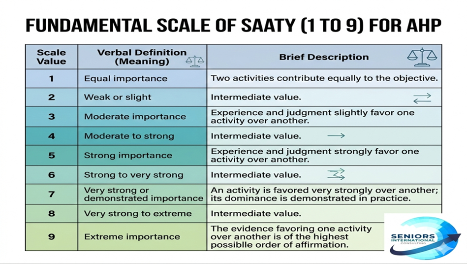 3.5 Global Health Consulting AHP is a structured framework that helps make complex decisions based on multiple criteria. This scale transforms qualitative judgments into quantitative values, facilitating objective evaluation and transparent, collaborative prioritization. Decision-making in organizations, especially in global health and consulting for SICs, faces significant challenges when stakeholders’ priorities differ, data are incomplete, or multiple competing options exist. This can lead to misaligned projects, wasted budgets, frustrated teams, and unattainable strategic goals.