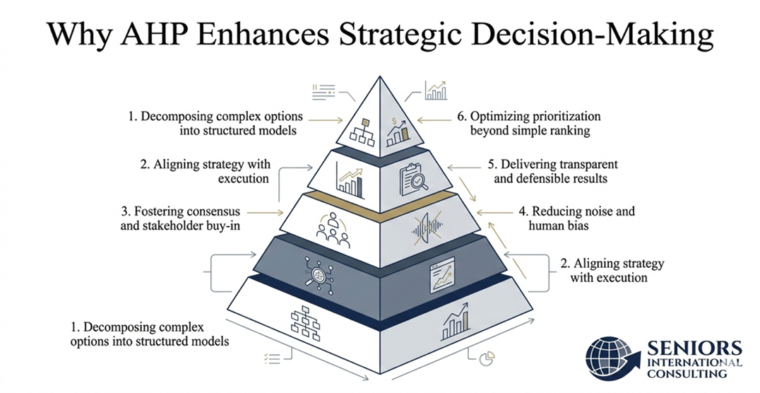 Application Context In global health, AHP helps prioritize interventions, allocate budgets, and assess risk in complex, dynamic contexts. In consulting for SICs, AHP is essential for aligning projects with strategic objectives, avoiding wasted resources and team frustration. Digital tools and intelligent dashboards enhance the practical application of AHP in real-world settings.