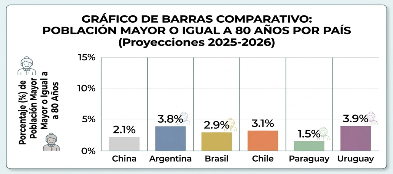 China, con una población total de aproximadamente 1,450 millones en 2026, tiene un 7% de población mayor de 75 años, impulsada por el Plan "Healthy China 2030" y el modelo "9073" que prioriza el cuidado domiciliario. El MERCOSUR, con cerca de 295 millones de habitantes, presenta un porcentaje variable de mayores de 75 años entre 6-9%, con sistemas fragmentados y políticas en desarrollo. Uruguay y Chile destacan por sistemas más formalizados, mientras Argentina y Brasil muestran heterogeneidad provincial.