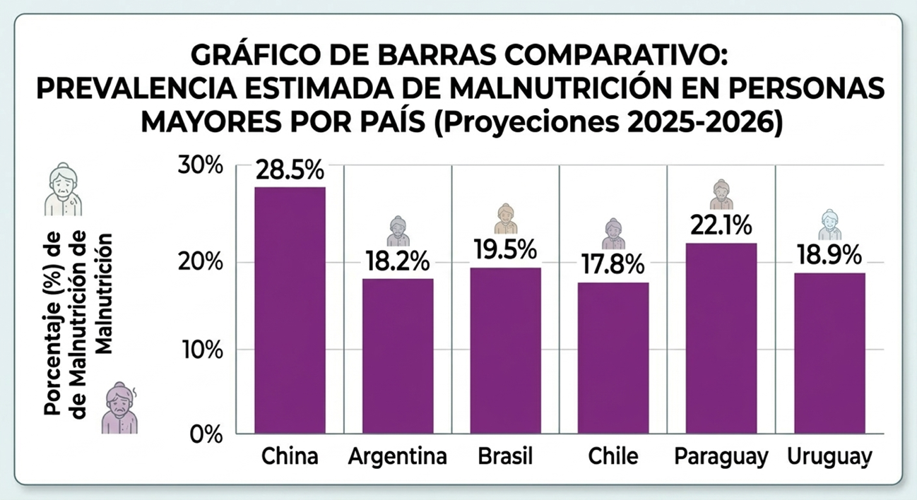 En China, la prevalencia reportada del 28.5% incluye un componente significativo de desnutrición por déficit calórico-proteico, especialmente en zonas rurales del interior, donde la inseguridad alimentaria y problemas de salud oral limitan la ingesta adecuada.