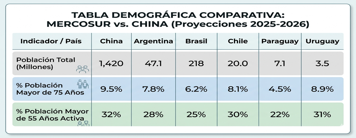 Tabla 1. Comparativa Demográfica MERCOSUR vs. China (2025-2026)